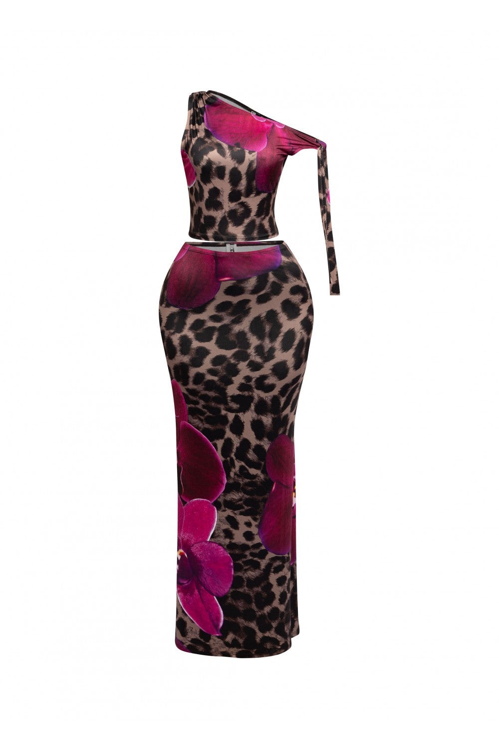Achieve a trendy and stylish summer look with our Flower Maxi Set. This set features a one shoulder design with a tied animal print and beautiful flower detailing. Made with high-quality materials, it provides both comfort and fashion, making it a must-have for your wardrobe.